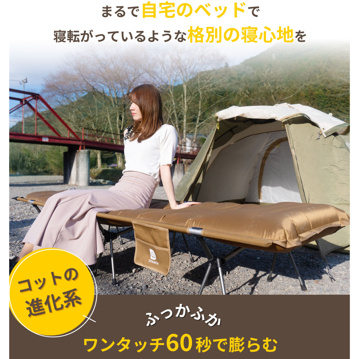 ワンタッチ60秒で膨らむ仕様で自宅のベッドのようなふかふか感を再現しました。